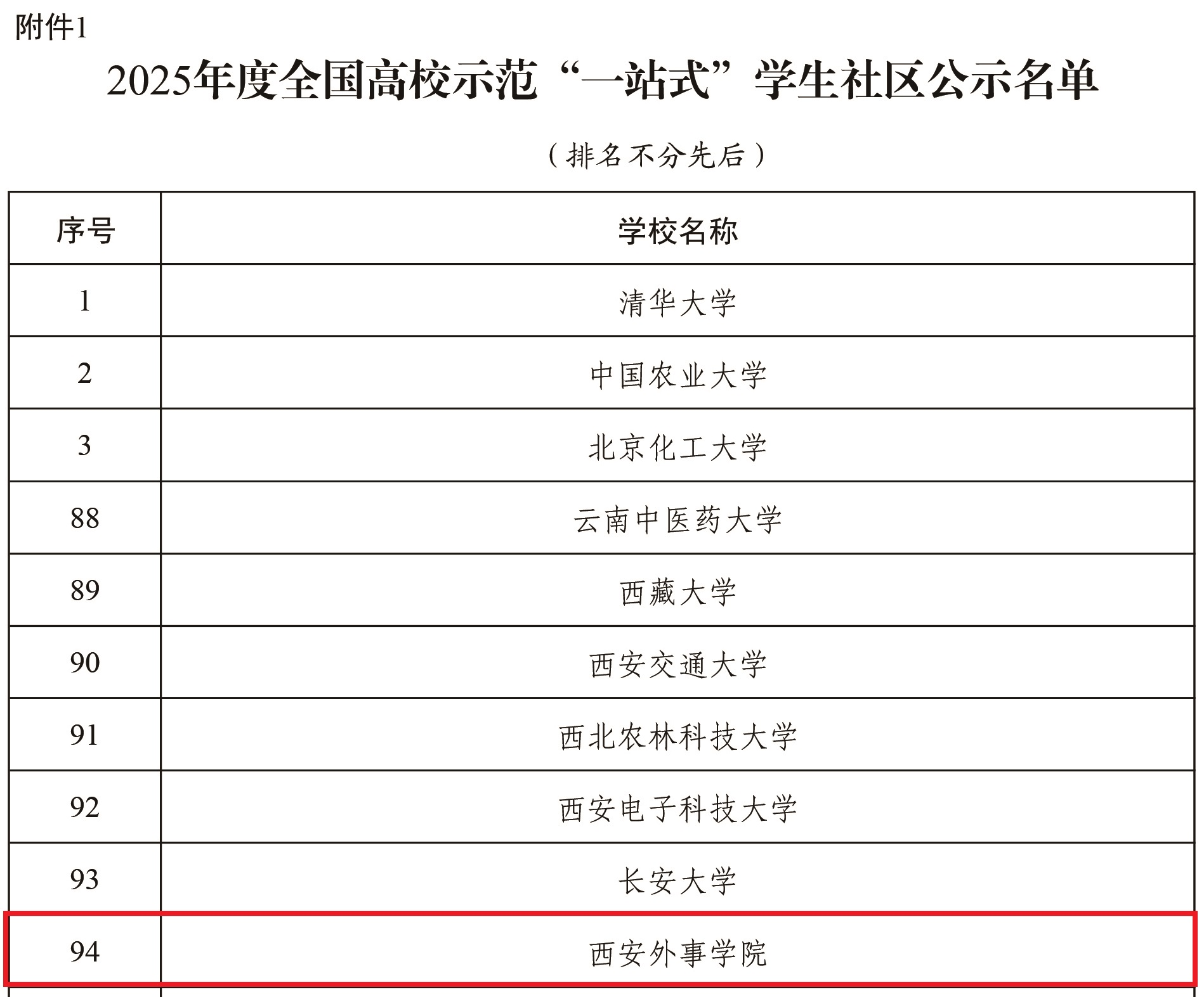 近日,教育部正式公布2025年度全国高校示范“一站式”学生社区名单(100所),西安外事学院作为陕西省唯一入选民办高校,与西安交通大学、西北农林科技大学、西安电子科技大学等5所公办学校共同跻身百强榜单。此次入选是西安外事学院在2019年成为教育部首批10所 “一站式”学生社区综合管理模式建设试点高校后,再度在此领域获得全国性殊荣,创下陕西省民办高校“一站式”学生社区建设的新标杆。