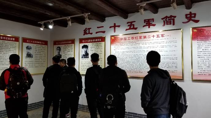 进入司令部大院,便能看到院墙上清晰的书写着“没收地主阶级的土地财产分给穷苦农民”的宣传标语。的确,无论是革命年代还是现在,为人民服务是党的根本宗旨,始终能够为贫苦的劳动人民做主这是中国共产党至始至终的初心和使命。在旧址的房屋内陈列有当年红军施用过的刀、枪等各种用具,墙上挂满了红二十五军将领的简介以及二十五军的行动历程。九支部的同学们仔细观摩学习,深刻的了解了老一辈无产阶级革命家的光辉历程。