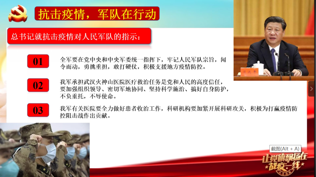 张锋同学作为第一位宣讲人,演讲的主题是“抗击疫情 军队先行”。作为一名退伍军人,他从抗击疫情军队行动、军事医学科学院的“防疫铁军”、我为防疫做贡献这三个部分讲述了军队的战友们为打赢这场疫情阻击战做出的巨大贡献。新冠肺炎疫情爆发后,人民解放军闻令而动,驰援荆楚,军事医学研究院的科研专家和医护团队第一时间赶赴武汉,支援武汉的防疫工作。张锋同学的宣讲让大家深切感受到了解放军战士“召之即来,来之能战,站之必胜”的斗争精神。