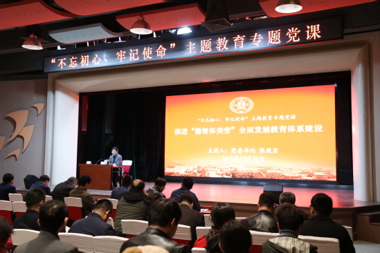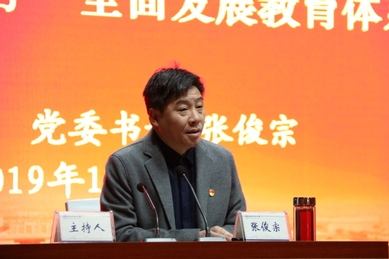 10月31日下午,西北师范大学党委书记、学校党委主题教育小组组长张俊宗教授以《推进“德智体美劳”全面发展教育体系建设》为题,为全校机关各部门主要负责人、各基层党委(党总支)书记、各学院党委(党总支)副书记、专职辅导员和师生党员代表讲授专题党课。