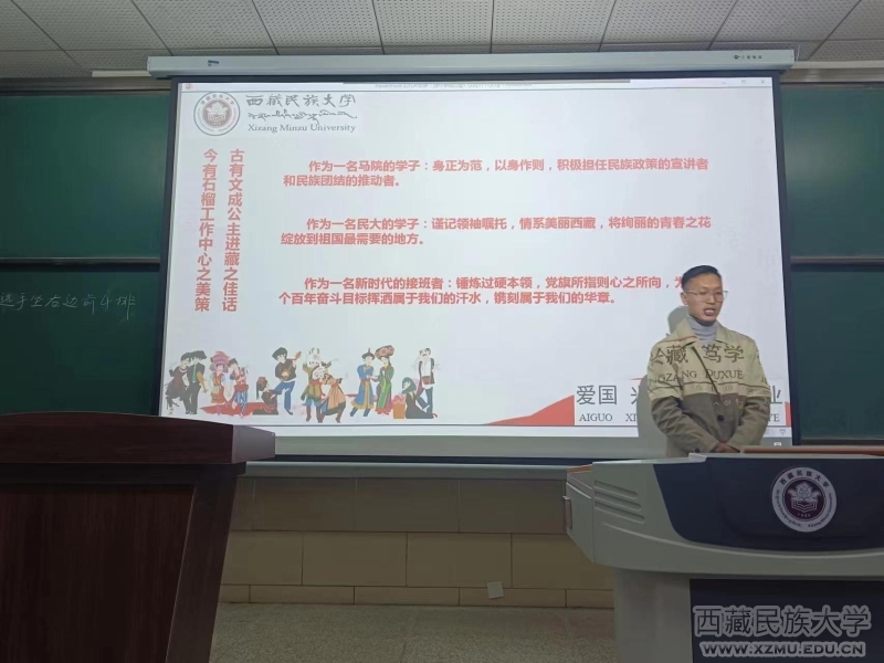为进一步促进学院师生铸牢中华民族共同体意识,引导广大青年学生增进交往交流交融和深化对民族团结进步教育活动的认识,携手构筑中华民族共有精神家园,西藏民族大学马克思主义学院开展了“铸牢中华民族共同体意识”主题授课大赛。11月1日晚,授课大赛进入决赛环节,比赛分为本科生和研究生两组,在初赛中脱颖而出的6名本科生和8名研究生参加了决赛,130余名本科生和研究生现场观摩了授课比赛。学院党委副书记马小龙、习近平新时代中国特色社会主义思想概论教研室主任李瑛、青年博士彭硕毅受邀担任评委。