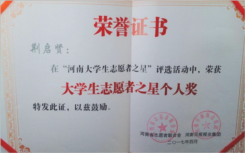 坚持党建、思政工作与品牌志愿服务相结合原则,组织成立“天使到家”爱心志愿服务实践团,参与学生近3000名,受益人数累计28000余人次的志愿服务薪火相传,于2017年4月荣获“大学生志愿者团队之星”,于2018年5月荣获“河南省教育系统学雷锋活动先进集体”,于2018年12月荣获河南省高校思想政治工作奖,被授予“河南省高校思想政治工作优秀品牌”荣誉称号。近些年的志愿服务活动,得到了许昌日报、许昌晨报、许昌市电视台、许昌县电视台以及河南电视台三农频道等新闻媒体的相关报道,取得了良好的社会效应,广受好评,社会影响深远。