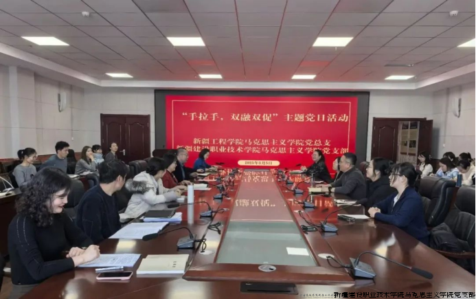为进一步促进党建在思政课教学的引领作用,以备课会为契机,新疆建设职业技术学院马克思主义学院党支部和新疆工程学院马克思主义学院党总支联合开展“手拉手 双融双促”主题党日活动。在活动中,全体党员教师在我院马克思主义学院党支部书记陈新刚带领下重温了入党誓词。新疆工程学院马克思主义学院第一党支部书记杨会萍领学《习近平论教育》(节选)。此次活动凸显了党建的引领作用,以党建联建促党建,促业务,有效提升了党建工作,实现了思政课教学资源共享、优势互补,增强双方在马院建设、人才培养等方面的交流合作,有利于推动思想政治教育工作与育人实践的深度融合与协同发展。
