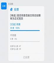 经三位同志提出转正申请、考察人介绍该同志这一年的考察情况、在场正式党员表决后确定三位同志成为中共党员。