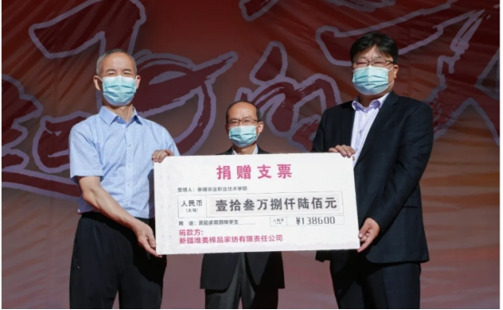 新疆唯美棉品家纺有限责任公司周建华向学院捐赠138600元,我院12名家庭困难学生代表现场领取资助奖金。