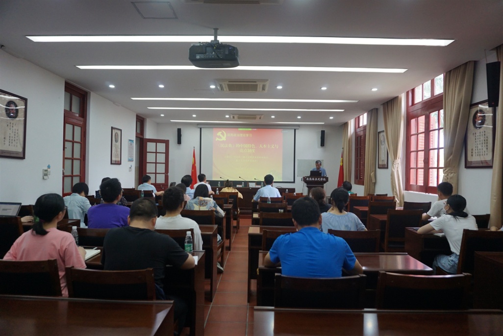 2020年7月8日上午,厦门大学马克思主义学院召开双周政治理论学习。会议邀请了厦门大学党委党校副校长、法学院教授何丽新作题为“《民法典》的中国特色、人本主义与亮点制度”的专题报告。学院党委书记侯利标主持了会议。会议主会场设在囊萤楼216报告厅,以线上线下方式同步进行。