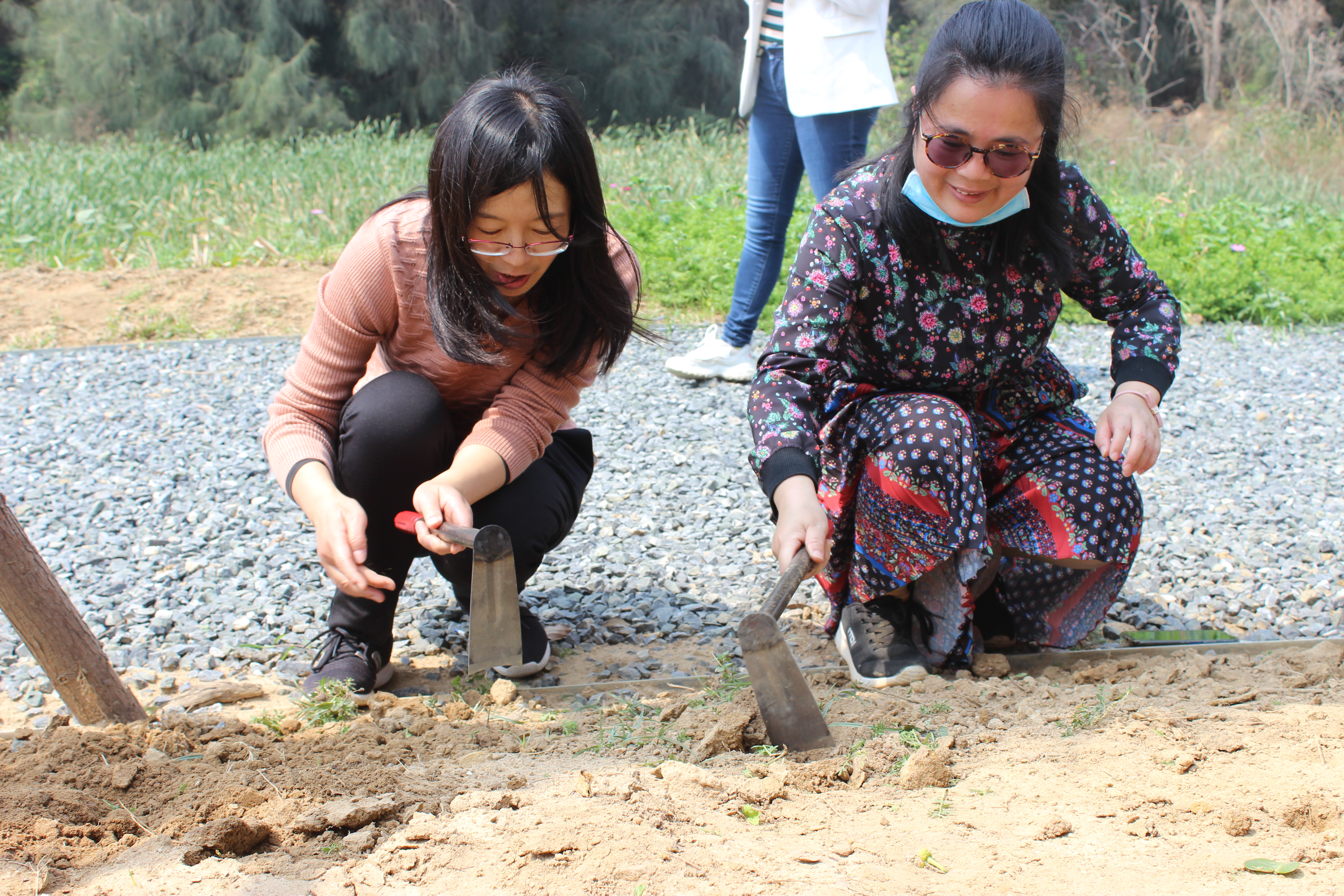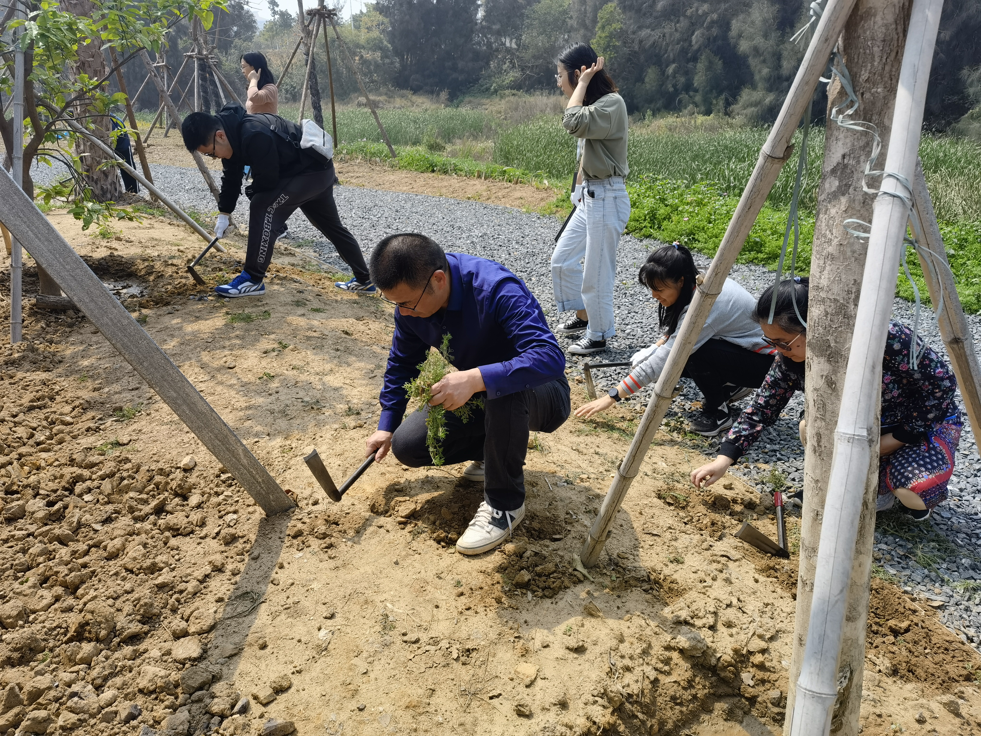 植树后,师生们来到了八闽园中的漳州文化小广场,拿起小锄头,积极开展了卫生保洁、植物种植、除草培土、园林养护等劳动。虽然时间已到正午,师生们头顶烈日,挥汗如雨,依旧干得热火朝天。