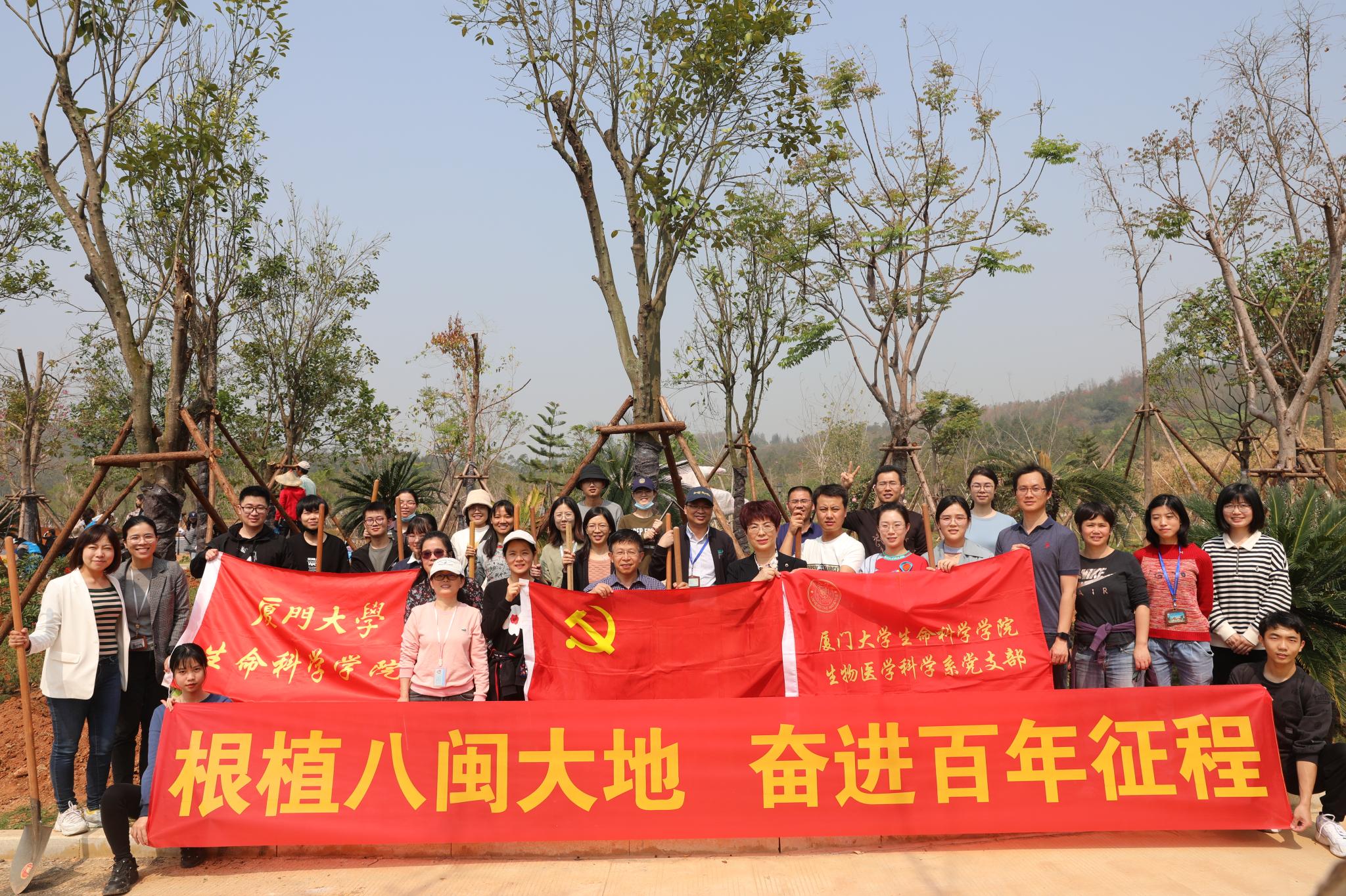 为深入贯彻习近平生态文明思想,充分发挥学校“八闽园”作为生态实践教学基地育人功能,创造更加优美的校园环境迎接建校百年华诞;同时为贯彻落实教育部《关于加强大中小学劳动教育的意见》,加强大学生劳动教育力度,培养同学劳动意识,2021年3月12日上午,我国第43个植树节,学院组织开展“根植八闽大地、奋进百年征程”植树活动。学院党委书记左正宏、生物医学科学系“双带头人”党支部书记吴乔、学院副院长李勤喜、学院党委副书记葛学凤、院长助理谢忠,生物医学科学系党支部、生物化学与生物技术1班党支部以及本科生第二党支部的党员代表参与了植树活动。