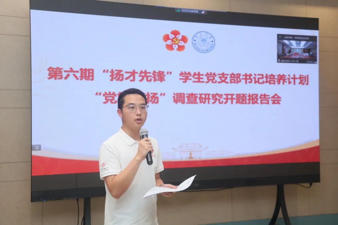 为全面贯彻落实党的二十大精神和二十届三中全会精神,巩固拓展学习贯彻习近平新时代中国特色社会主义思想主题教育成果,9月26日,第六期“扬才先锋”学生党支部书记培养计划举办“党旗高扬”调查研究开题报告会。第六期“扬才班”班主任、校党委组织员兼党的建设工作办公室副主任陈秋虹老师出席,第六期“扬才班”学员和指导老师通过线上、线下方式参会。活动由扬才先锋党支部组织委员林冬旭主持。
