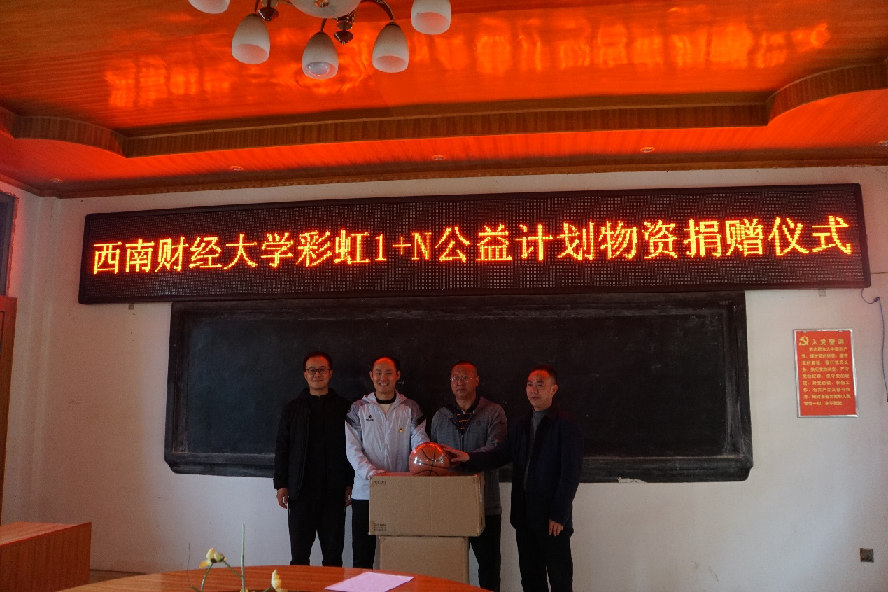 值得一提的是,为确保支教资源的平稳过渡与集中发力,美姑县中学专门成立了高中西财班,未来西财的每届研支团队员将接力负责该班级教学,形成教育帮扶的合力。来到西财班,刘坤老师运用鲜活的案例开展了职业规划教育,徐天然老师结合学生生活进行了普法教育。两位老师还代表彩虹“1+N”公益计划向美姑县中学捐赠了文具、体育用品等物资。