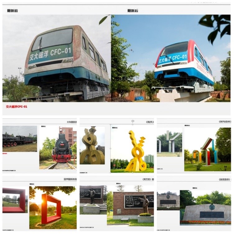 1、机车园机车翻新工程、雕塑翻新及绿化工程。对学校大型雕塑、机车园机车做翻新保护处理,修复周边绿化,让校园标志性建筑熠熠生辉,有力传承交大轨道交通历史文化。