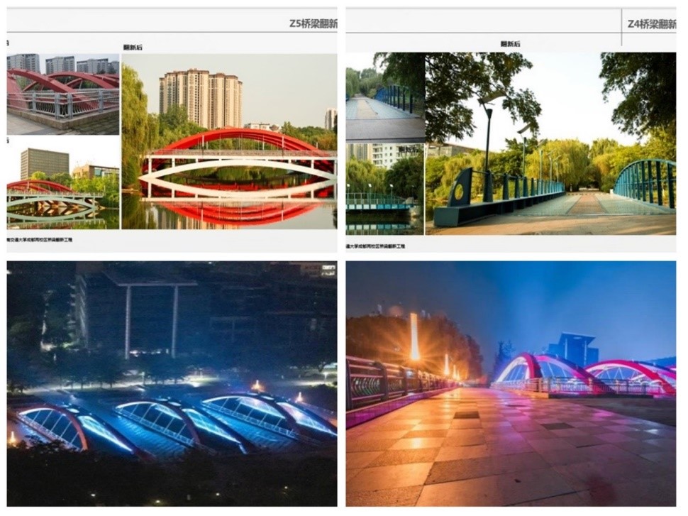 2、桥梁翻新及氛围灯加装工程。翻新工程包括九里校区2座镜湖桥,犀浦校区12座桥梁的翻新改造,同时在桥体上加装氛围灯,为美丽校园增添色彩。