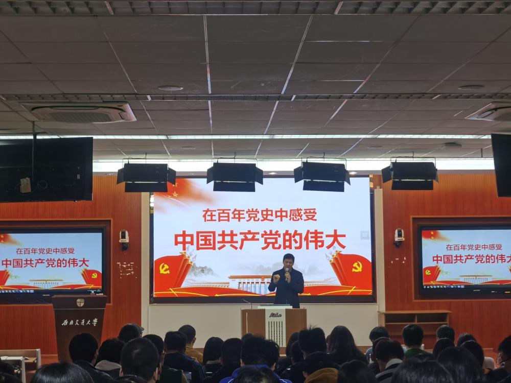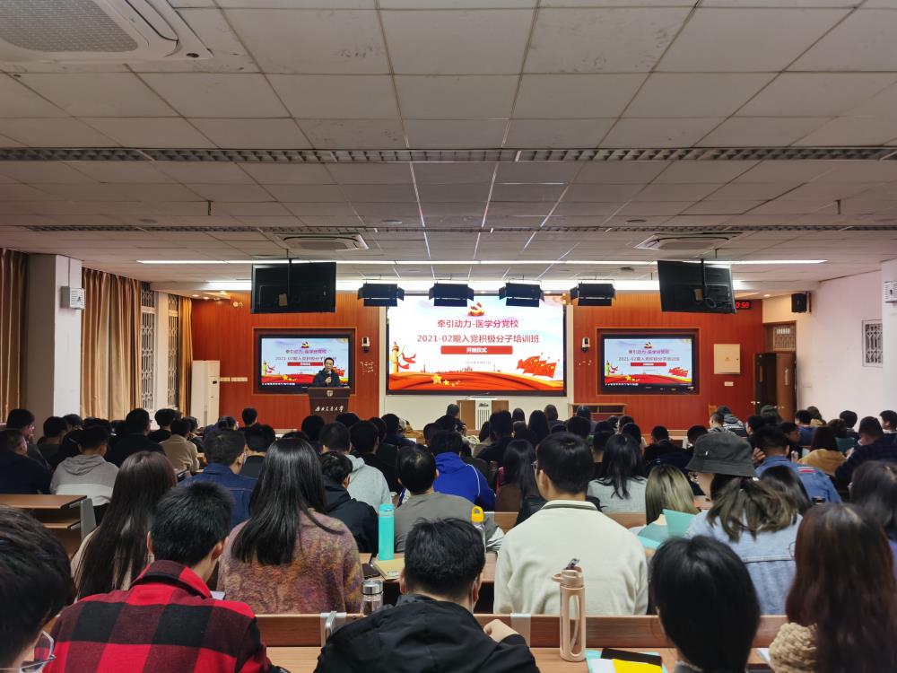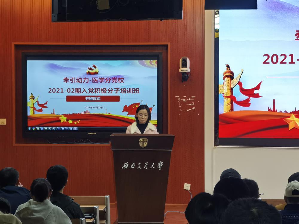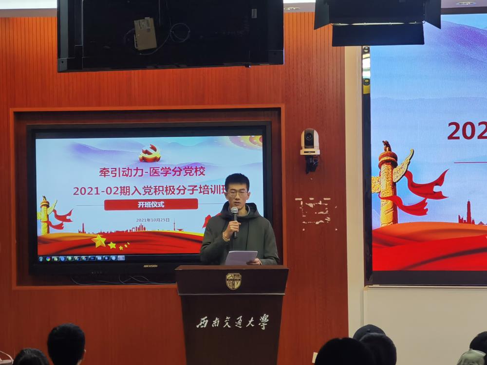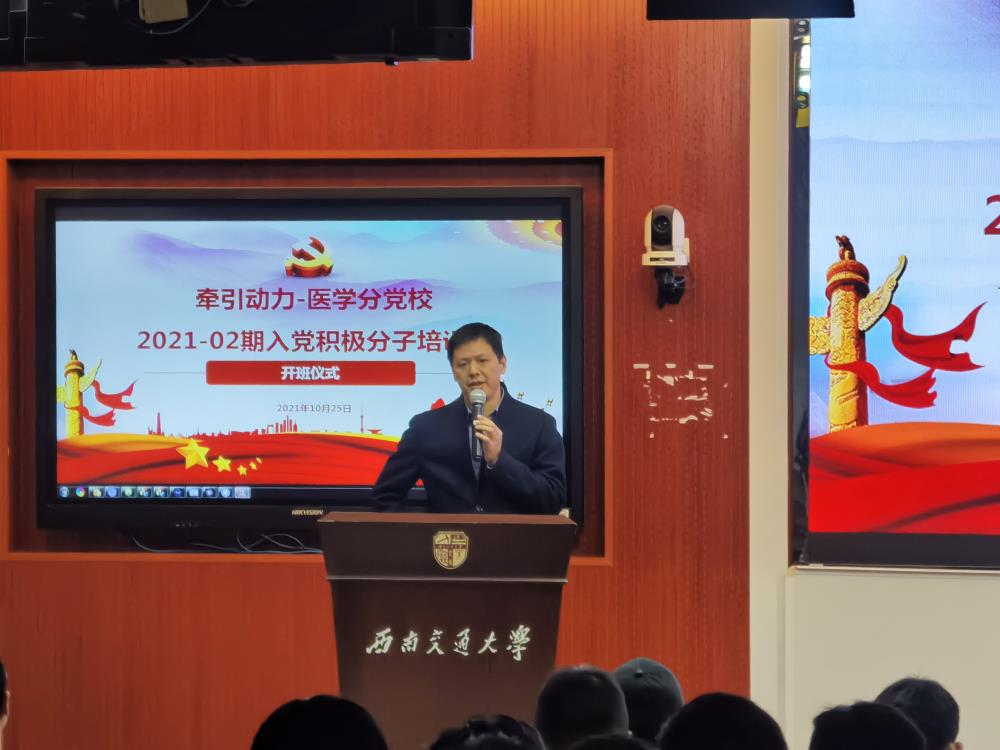 为深入学习贯彻习近平新时代中国特色社会主义思想,认真学习领会习总书记“七一”重要讲话精神,切实做好入党积极分子培养教育工作,10月25日下午,牵引动力-医学分党校在九里校区4105教室举办了2021–02期入党积极分子培训班开班仪式暨第一次专题党课。医学院党总支书记李锦红、牵引动力国家重点实验室党委副书记李莹、专职组织员李向蔚、学工组副组长余卉,医学院学工组副组长胡豪、专职组织员蔡俊俊出席仪式。仪式由胡豪主持,共计142名入党积极分子参会。