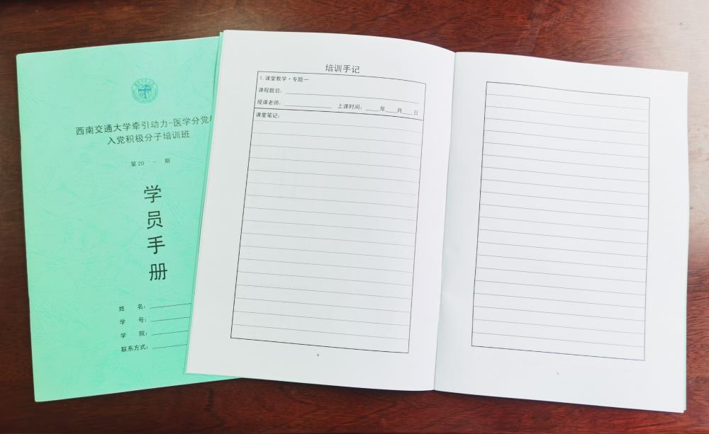本次培训,分党校专门设计制作了《牵引动力-医学分党校入党积极分子培训班学员手册》,手册除具有签到功能外,还为学员们设计了每一节课程笔记记录、撰写心得、实践总结的板块。希望同学们努力学习、认真记录每次课程的心得体会,从参加入党积极分子培训开始以党员的标准严格要求自己。