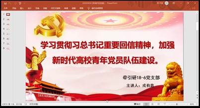 为了深入学习领会、全面贯彻落实习近平总书记给北京大学援鄂医疗队全体“90后”党员回信的重要精神,积极为决胜疫情防控阻击战贡献新时代青年党员的智慧和力量。牵引研18-6班党支部于4月30日通过腾讯会议的方式召开学习贯彻“习近平总书记重要回信精神加强新时代高校青年党员队伍建设”主题党日活动。此次主题党日活动由党支部书记戎有鑫主持,主要围绕“习总书记重要回信精神学习”、“青年战疫事迹视频学习”和“交流研讨”三个方面展开,支部全体党员、积极分子共20人参会。