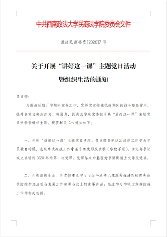 民商法学院党委响应中央号召,安排各支部开展组织生活暨“讲好这一课”主题党日活动,希望各支部把这次战疫工作变为党员教育时机,选取本次战疫工作中某个角度形成讲稿,讲好2020年的第一次党课。