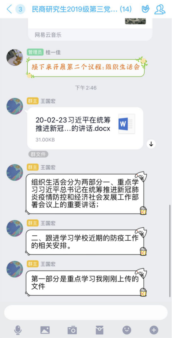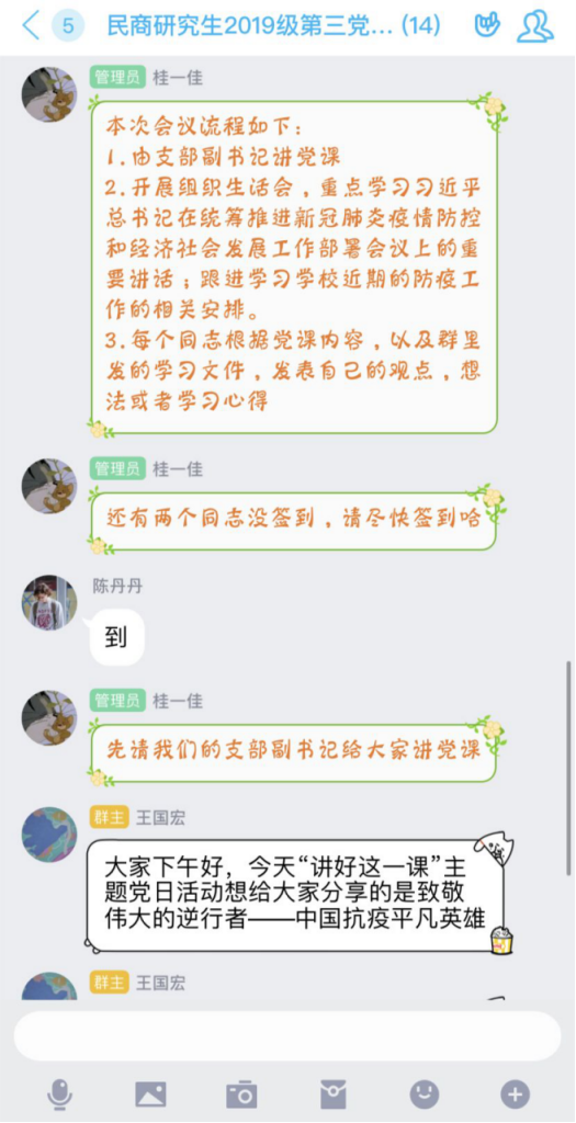 民商法学院党委各个支部没有因为疫情延迟开学,就放松党课和政治学习。