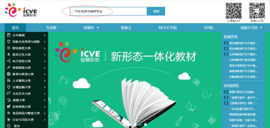 (2)登录智慧职教网址:https://www.icve.com.cn, 再搜索“汽车检测与维修专业”。