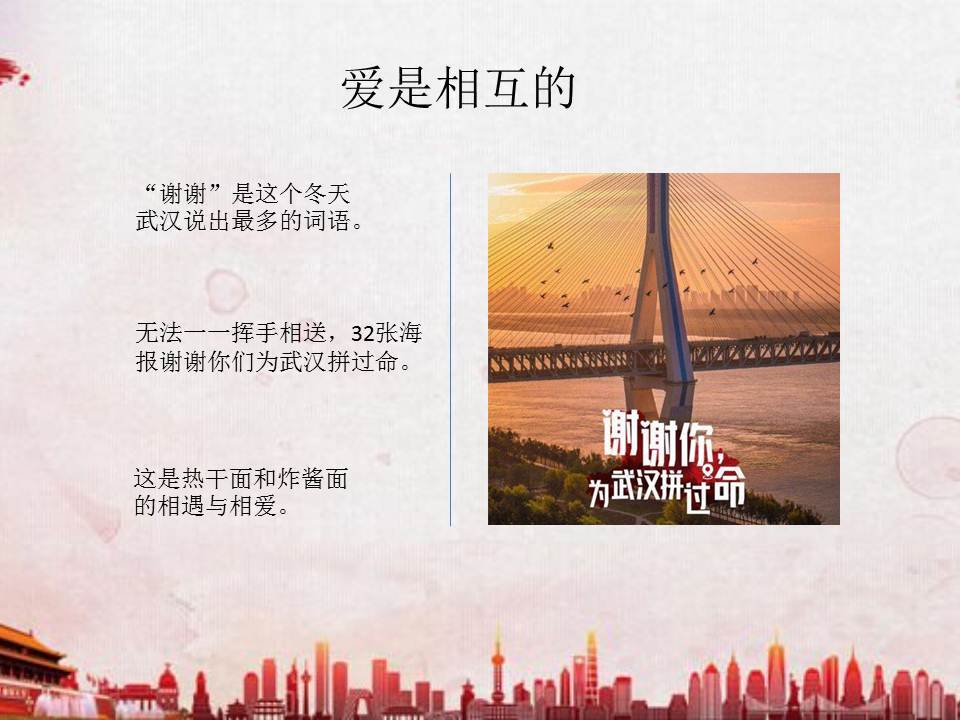 我自豪于中国精神与中国力量。八十岁的钟南山院士奋不顾身地冲向前线,众多医学者刻苦专研抗疫疫苗,全国14亿人众志成城抗击疫情……那是不畏生死的精神,是刻苦专研的精神,更是国人的团结,这些都凝聚成阻挡病毒的铜墙铁壁。面对生病的武汉,各省市争分夺秒地伸手驰援,来自四面八方的医务人员携手同行,并肩作战。正如武汉所宣传的那样,爱和希望,比病毒蔓延的更快,每一种爱,都刻进武汉的心脏。病毒拉开了我们的距离,却让我们的心离得更近。武汉病了,全国人民同心同德帮助它赶走病魔,重见光明,这是中国精神与中国力量凝聚而成的力量。