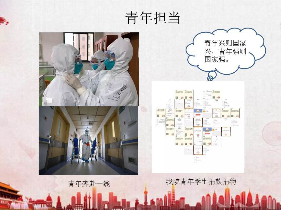 我自豪于我国青年的担当与大爱。这场疫情防控中,无数担当大任的青年义无反顾地奔赴一线,换了一身衣服,学着前辈的样子治病救人。又有青年学生,贡献自己的绵薄之力,捐款捐物,担任志愿者加入疫情防控。这样一群敢于担当的青年为我们诠释“青年兴则国家兴,青年强则国家强”,我们定然会走出阴霾,迎来黎明。