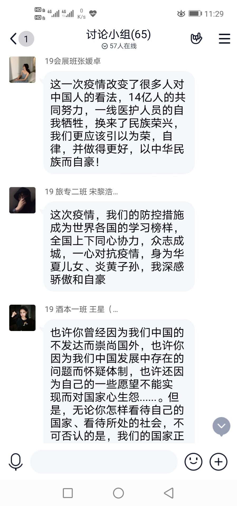 从这次疫情的胜利,我们可以看到中国强大的组织能力和凝聚力,我们也能感受到中国速度带来的震撼。作为学生和青年,我想我们只有更加努力才配得上所有人的辛苦。我为中国骄傲个自豪。