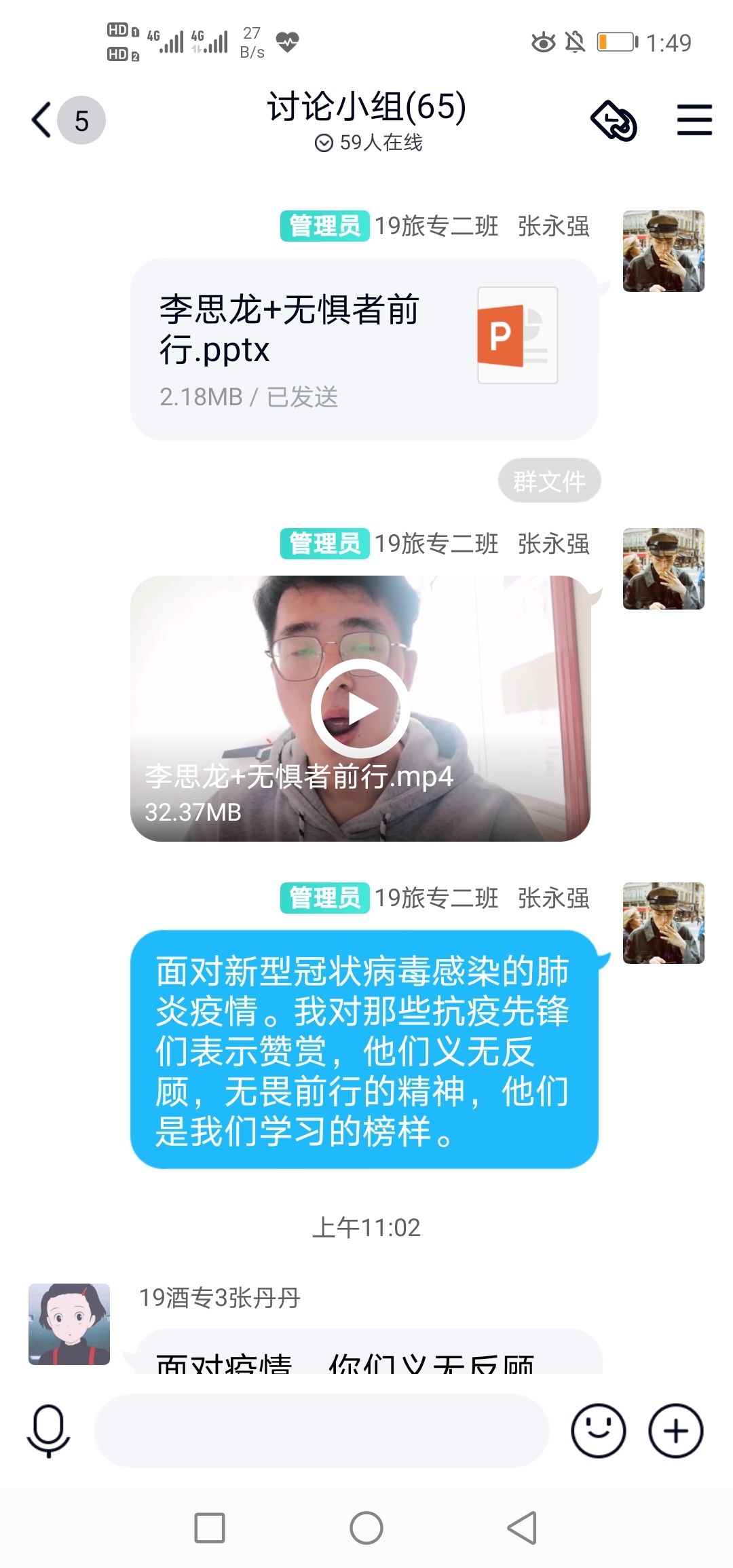 为使广大青年学生将疫情期间所体现的精神力量贯彻到实践之中,更好的传递青春正能量,酒店管理专业学生党支部组织17,18,19级学生代表线上开展对“最美逆行者”的理解及在宣讲过程中的认知和感触活动。