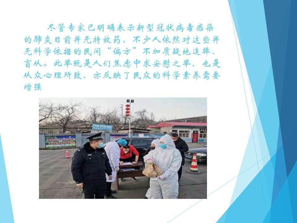 尽管专家已明确表示新型冠状病毒感染的肺炎目前并无特效药,不少人依然对这些并无科学依据的民间“偏方”不加质疑地追捧、盲从。此举既是人们焦虑中求安慰之举,也是从众心理所致,亦反映了民众的科学素养需要增强。