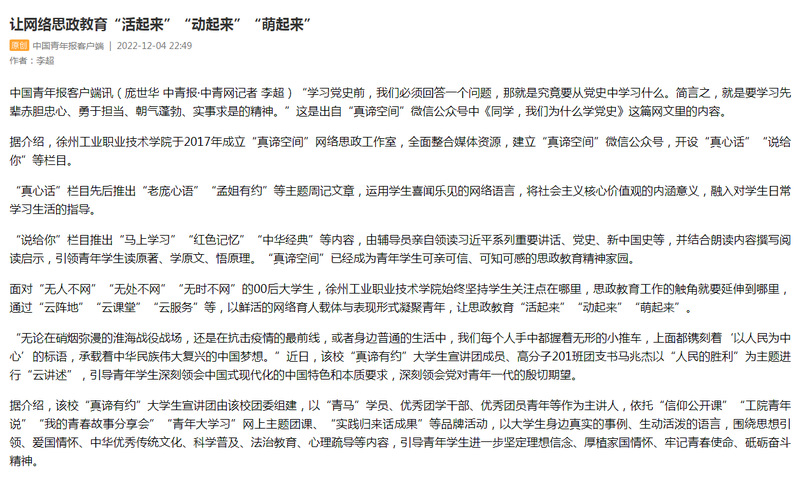 据介绍,徐州工业职业技术学院于2017年成立“真谛空间”网络思政工作室,全面整合媒体资源,建立“真谛空间”微信公众号,开设“真心话”“说给你”等栏目。