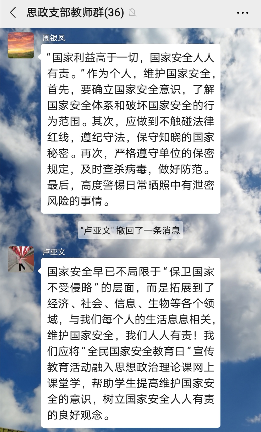 国家安全,人人有责,思政课教师本着很强的使命感,认真学习安全教育法律法规,广泛交流研讨,并做好笔记。家是最小国,国是千万家。国家安全关乎每个人的切身利益。国家安全包括传统安全和非传统安全,具体有11个方面的内容:政治安全、国土安全、军事安全、经济安全、文化安全、社会安全、科技安全、信息安全、生态安全、资源安全、核安全。大家纷纷表示,维护国家安全是每个人应尽的责任和义务,作为思政课教师要带头践行国家法律,做自觉维护国家安全的表率。