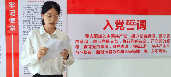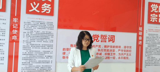 宣誓活动在庄严的《国际歌》中拉开序幕,聂文秀带领全体新发展党员面对鲜红的中国共产党党旗庄严宣誓。新发展党员代表李雪芹进行发言,向党表明了决心,作出了庄严承诺,今后将按照党章标准更加严格的要求自己,认真遵守党的纪律和各项规章制度,坚定共产主义理想和信念,努力发挥先锋模范作用。