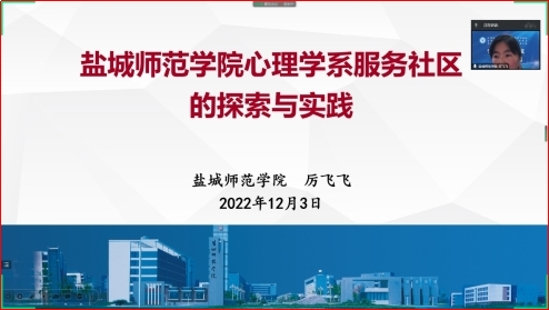 我支部成员参加2022年12月3日江苏省心理学会2022年学术分论坛社区心理专业委员会学术年会,向兄弟高校学习服务社区的有效经验,同时支部向社区心理专业委员会汇报了心理学系2022年服务社区的具体工作,总结为“三走进”“三特殊”。