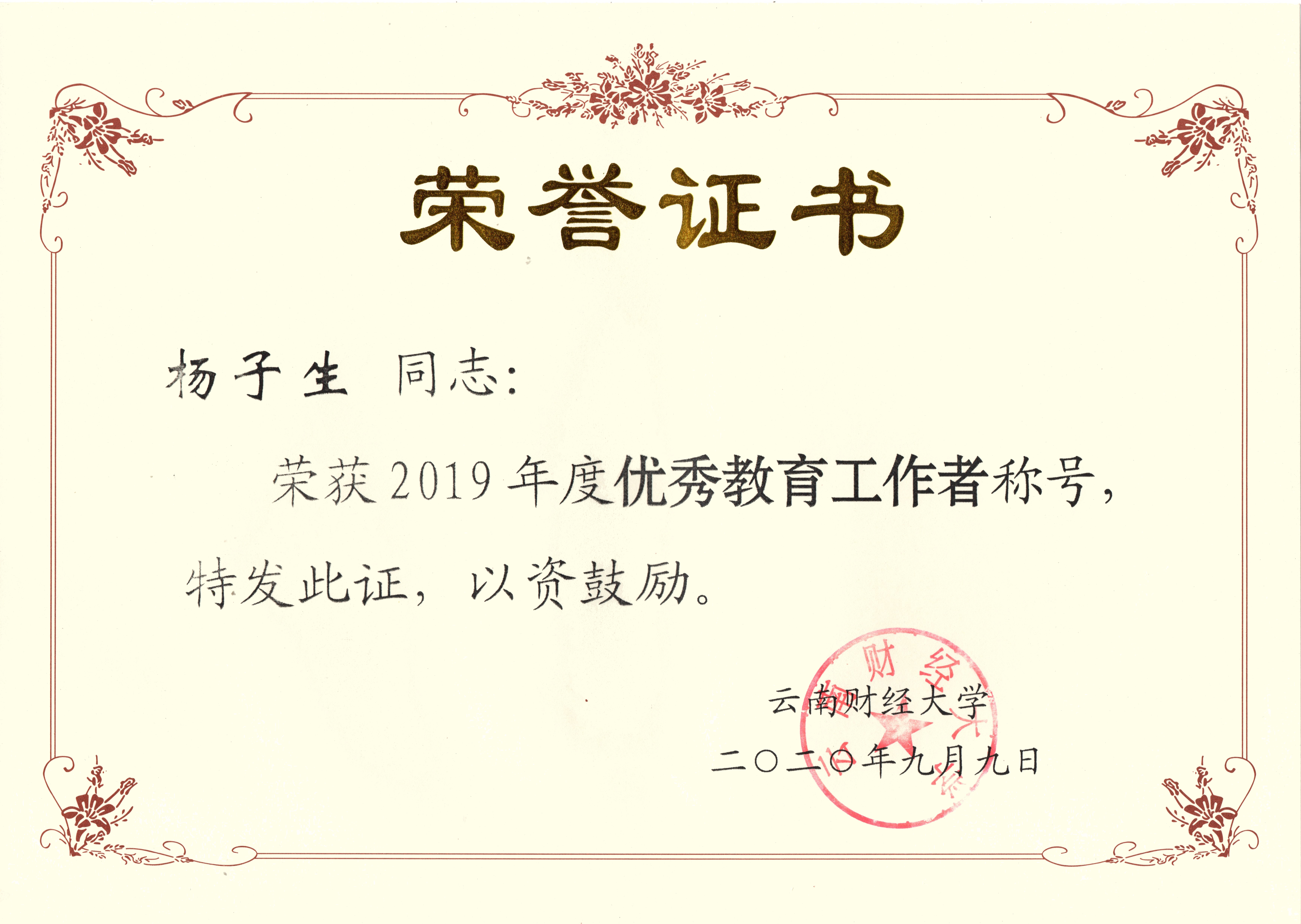 图1 杨子生教授获云南财经大学“优秀教育工作者”表彰