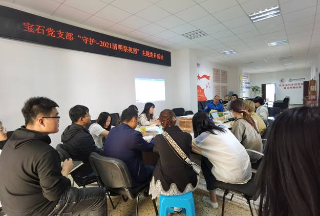 2021年4月14日下午宝石党支部全体党员教师在勘物楼A311举行2021年“清明祭英烈”主题党日活动。习近平总书记提出要不忘先进事迹,饮水思源,不忘革命先烈,要求广大党员认真学习革命先烈的事迹,传承革命先烈的精神。会上珠宝旅游党总支书记杨飞就学习榜样的意义和作用进行了发言。他提到只有铭记历史,才能继往开来。向榜样学习,比照自身不足,才能有所提高。会上宝石党支部全体党员教师在党支部书记李继红老师的带领下学习了习近平的系列讲话内容,聆听了八位烈士的故事后党员们发表了自己的学习心得感言。最后全体党员和入党积极分子在网上祭扫了先烈。