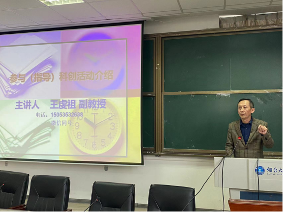 研讨前,孙丰云同志结合即将举办的烟台大学2023年“挑战杯”大学生课外学术科技作品竞赛通知要求介绍了开展本次活动的初衷和意义。会上,学院党总支副书记王虔祖做了关于《参与指导科创活动介绍》的主旨报告,他结合自身经历从指导大学生科创项目出发点、重要关注考核点、“挑战杯” 大学生课外学术科技作品竞赛的作品类型、申报细则、评审基本原则几个方面给参会的青年教师做了详细介绍。