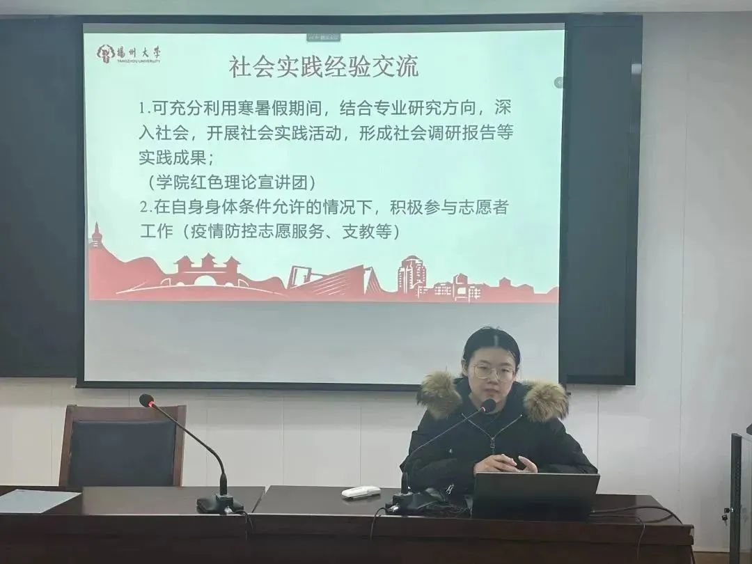 支部党员郝语同志现任校研会综合办公室副主任,21级学硕思政专业班长,被评为校研会“优秀志愿者”、院“优秀共青团员”等,郝语同志通过自身的实践经历,如学院红色理论宣讲团、疫情防控志愿服务、校研会志愿者招新等活动,向支部成员们展开社会实践交流分享。她表示,学术研究与社会实践并不冲突,作为学术型研究生,可以通过校内外的实践活动缓解学习压力,并且积极参与工作能增强自身的责任心。她强调,在中华民族伟大复兴的关键时期,广大青年要勇担时代重任,练就过硬本领,只有这样才能奏响更为激昂的青春乐章。