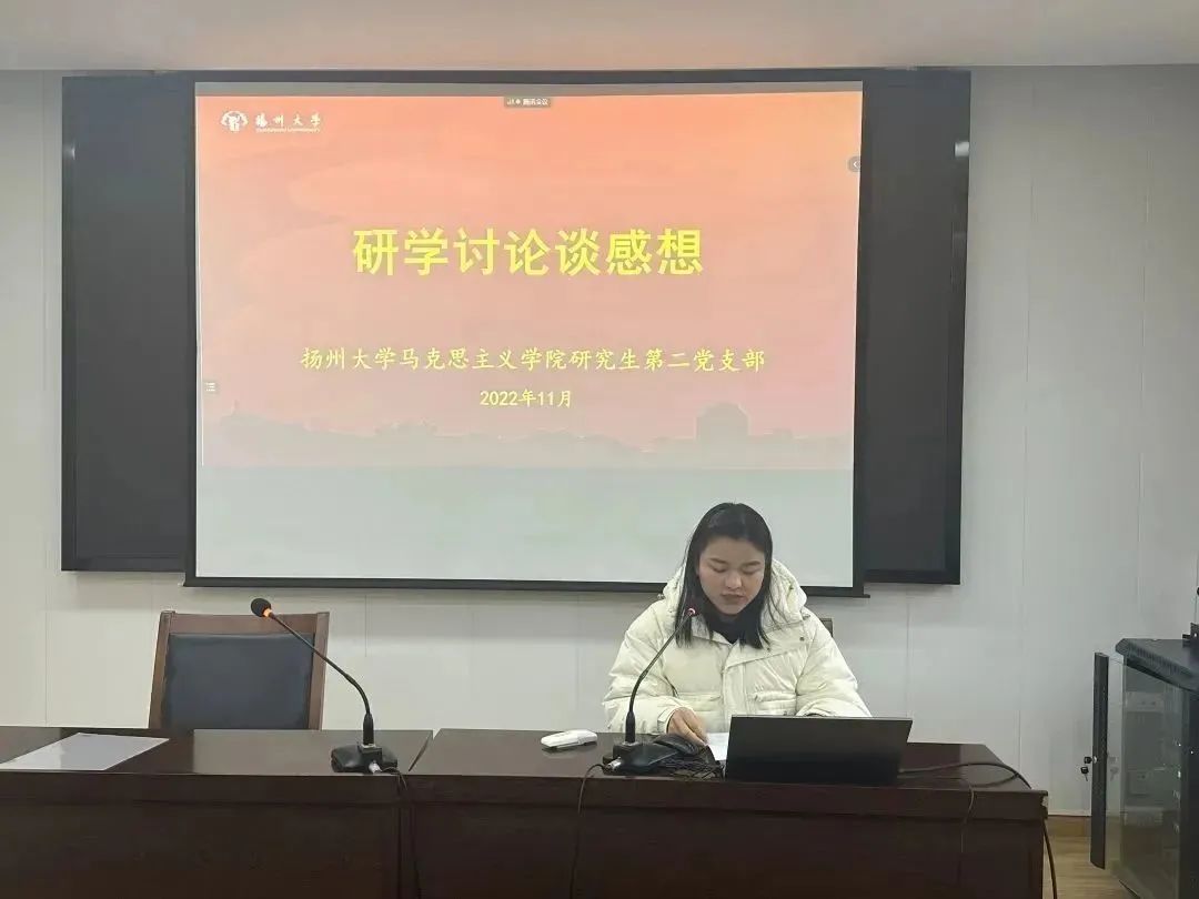 为深入学习宣传贯彻党的二十大精神,充分发挥样板党支部的引领带动作用。11月30日下午,扬州大学马克思主义学院研究生第二党支部开展“青春献礼二十大 踔厉奋发新征程”主题党日活动。本次活动采取“1+2”模式,由支部党员带头宣讲微党课,支部优秀成员分享科研及实践经验。支部书记王艳红老师主持此次活动,支部研一、研二全体党员及入党积极分子到场参加。