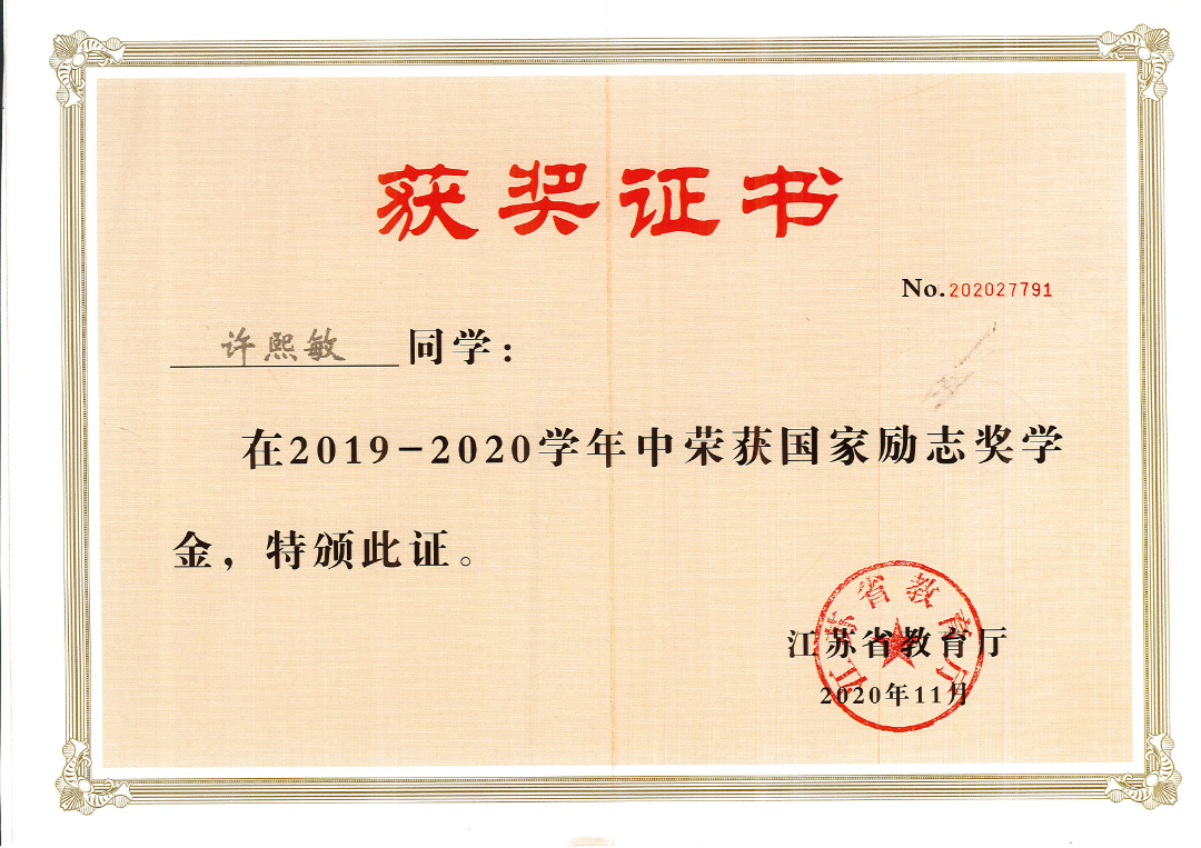 许熙敏,中共预备党员,来自社会发展学院历史1902班,现任历史1902班团支书,曾任历史1902班班长。曾连续两次获得国家励志奖学金和校优秀共青团员的荣誉,连续两次在全国英语写作比赛中获得优秀作品奖,并多次获得优秀实践团队的荣誉;曾主持校重点科创项目一项,在《中学历史教学参考》上发表论文一篇,参加省级科创项目一项。