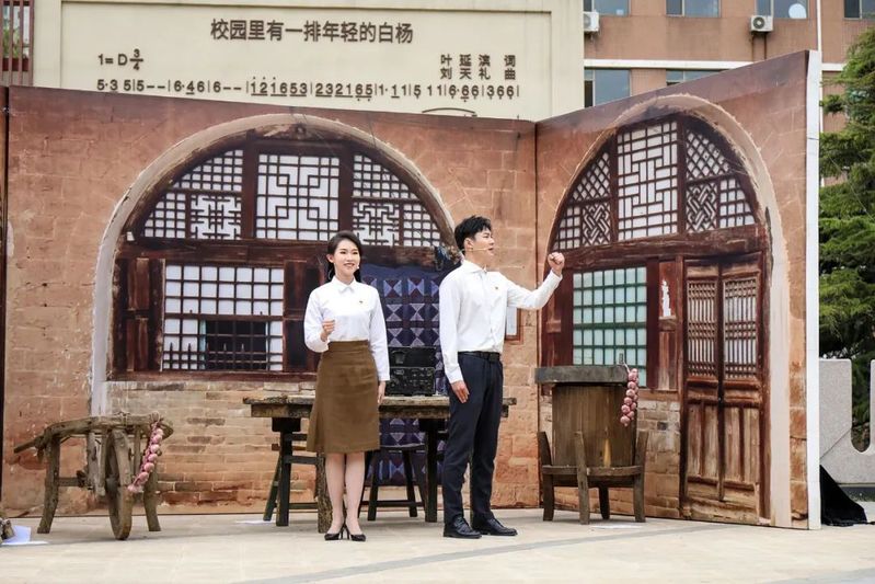 在搭建的延安窑洞场景前,两位中传学子朗诵着播音名篇《永不消逝的声音》:“一个响亮而振奋人心的声音,从延安传向全国各地。‘延安新华广播电台XNCR,现在开始播音’。中国共产党领导的第一座、第一座广播电台诞生了!”铿锵而富有感染力的声音,穿透历史的长河,传递出青年一代传承红色基因的使命自觉。