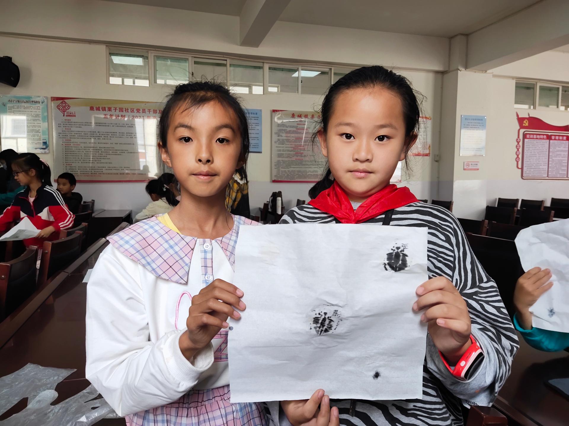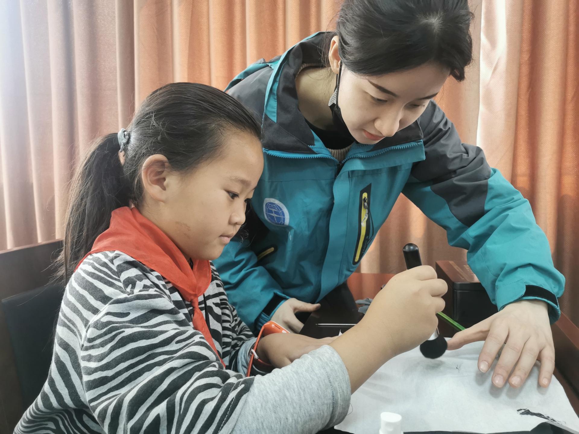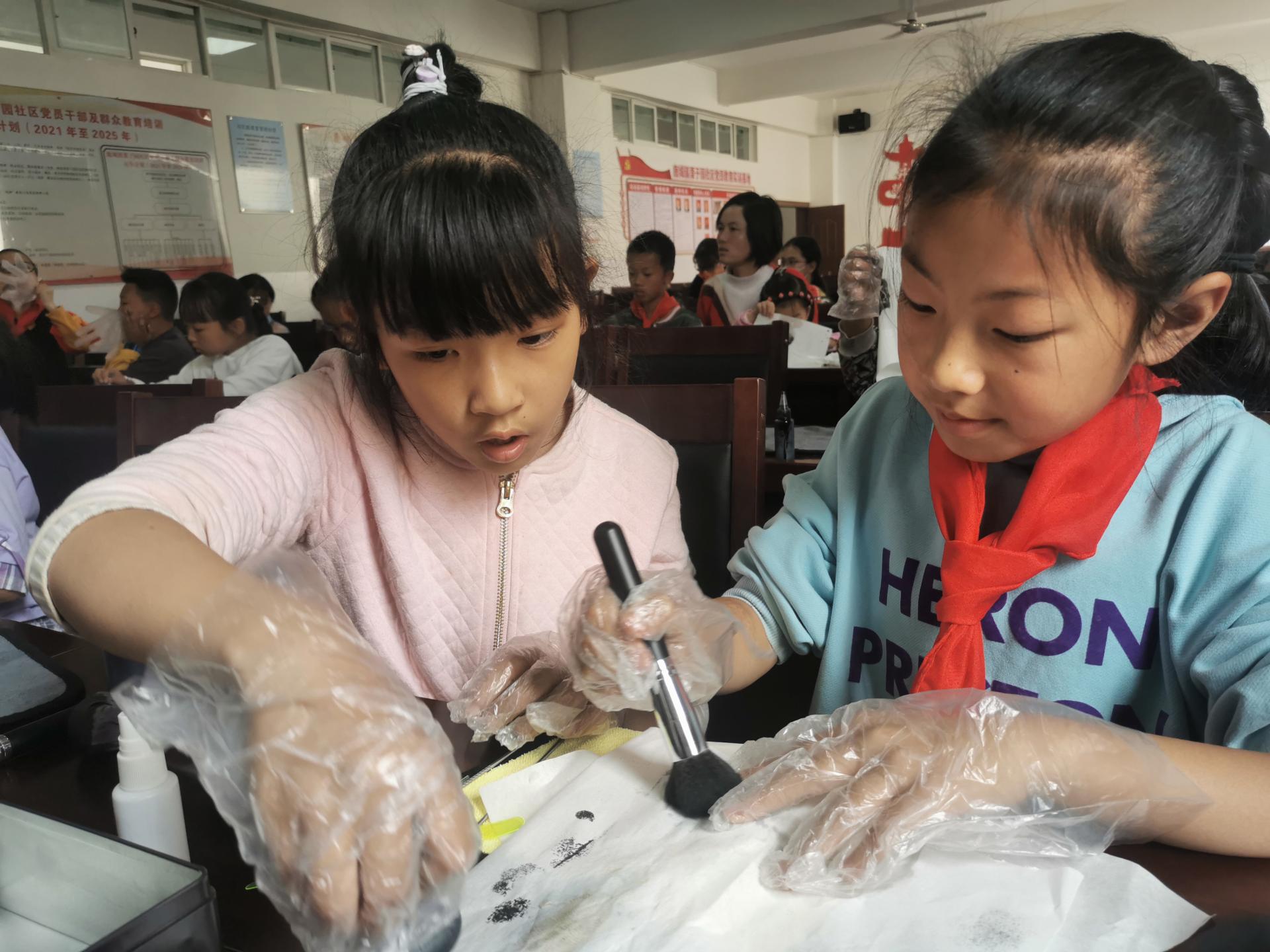 中国地质大学研究生支教团队员和孩子一起拓印化石 张馨月摄