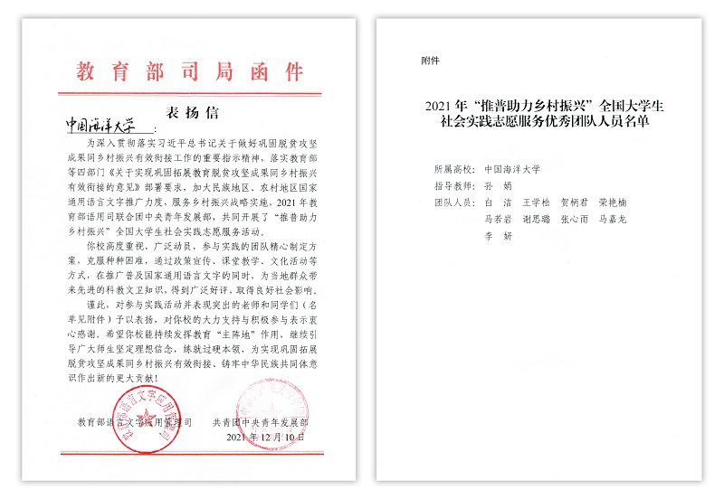 日前,教育部语言文字应用管理司、共青团中央青年发展部联合向中国海洋大学发来表扬信,对学校在“推普助力乡村振兴”全国大学生社会实践志愿服务活动中的突出表现和取得的良好社会影响进行肯定,同时对外国语学院“山海相依”推普实践团队提出表扬。
