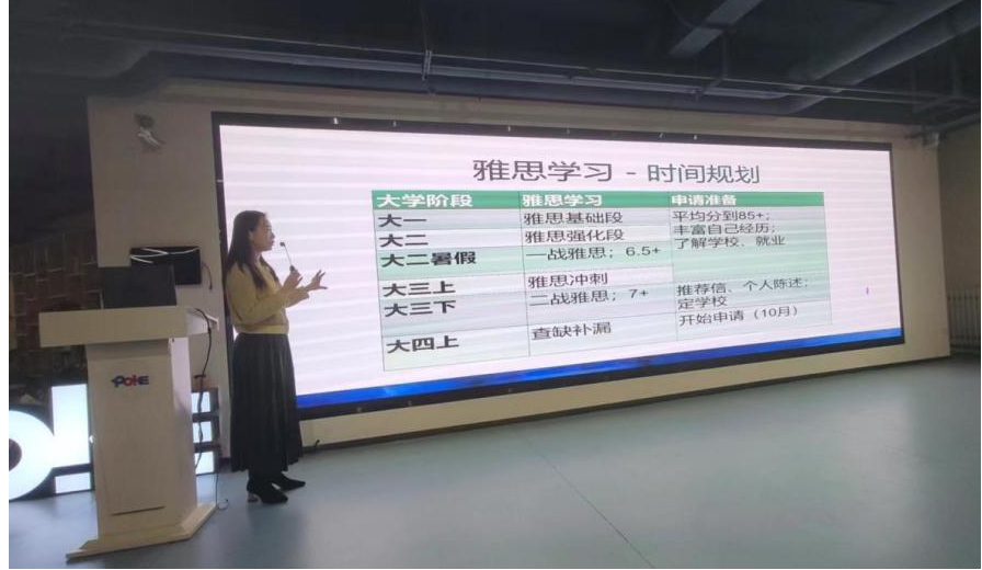 在分享的最后,老师向同学们介绍了她强烈推荐的雅思学习时间规划——大一是雅思学习的基础阶段,同学们应打好基础;大二是雅思学习的强化阶段,大家应不断钻研、深入学习;大二暑假可以选择一战雅思,检测自己的水平;大三上学期是雅思学习的冲刺阶段,大家需进一步强化自己的能力、不能懈怠;大三下学期可以选择二战雅思;大四上学期则是雅思学习最后的查缺补漏阶段。通过对时间规划的分析,老师鼓励同学们及时行动、把握机会、努力进取。