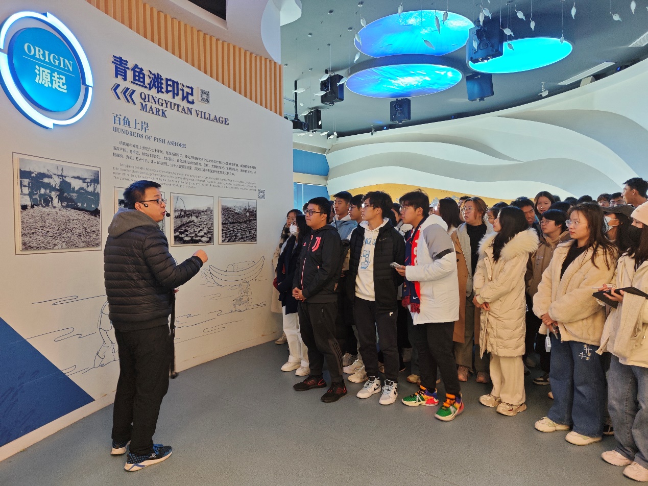 11日下午,实践队员来到位于山东荣成爱伦湾的寻山集团,参观以海洋产业为主的农业产业化国家重点龙头企业,这里也是首批国家高技术研究发展计划成果产业化基地。在爱伦湾畔,五彩的环保浮漂把上万亩海区分割成海上特有的“阡陌交织”,一艘艘挂机船在其间穿梭,养殖工人从浮漂维系的筏架下拖拽起一串又一串笼子,笼内就是肥美的鲍鱼。在国家级海洋牧场展厅,同学们了解到寻山集团与科研院所通力合作,开创了“北鲍南养”的先河,成功实现了鲍鱼产量质量双提升。同学们在沉浸“海洋牧场”之美的同时,更加深化了对现代科学技术赋能水产养殖业的感知,充分体验了高新技术带给水产领域的高效、高质和高能。