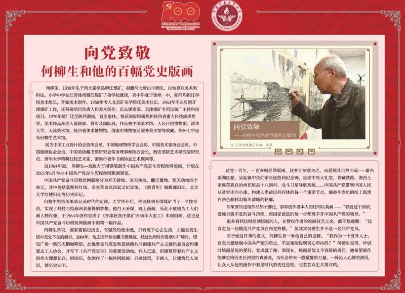 学校扎实开展党史学习教育,用优秀的党史艺术作品鼓舞激励师生,由我校校友何柳生创作的《中国共产党奋斗历程系列丝网版画》在学院路校区图书馆前展出。画作以中国共产党历史上的重大事件或旧址为素材,分为新民主主义革命时期、社会主义革命和建设时期、改革开放和社会主义现代化建设新时期、中国特色社会主义新时代四个时期。百幅丝网版画艺术作品用百画讲百年,讲述中国共产党如何带领中国人民取得一个又一个伟大胜利,如何成为我们各项事业的领导核心。