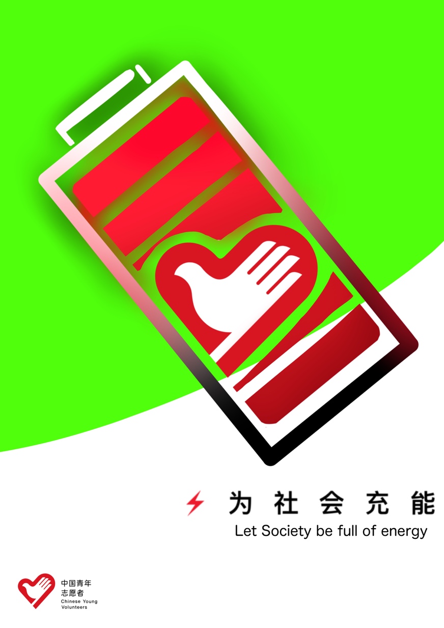 海报将心手标与电池结合作为视觉中心,用电池作为形象来引导联想到充能,并且电池的形象在生活中随处可见,也说明了这种志愿服务的精神在生活中是尤为重要的。红色的主色调既代表着志愿服务又体现了新时代社会发展的核心是走中国特色社会主义道路。底色的亮绿色利用互补色原理衬出了主体的红色电池。
