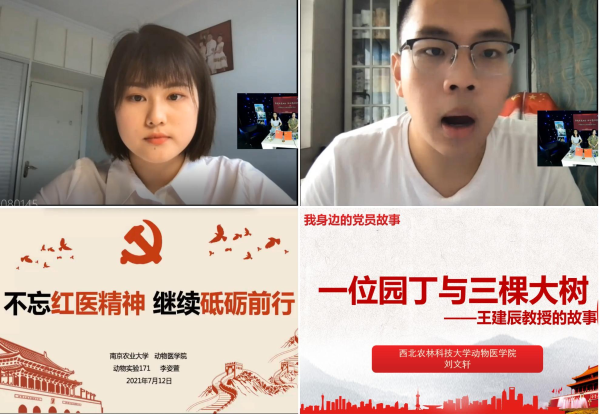 来自华南农业大学、华中农业大学、南京农业大学、西北农林科技大学四所高校的党员学生代表向参加活动的师生分享了红色故事。华南农业大学的黄颖然分享的布衣院士卢永根的先进事迹,点燃了同学们心中的爱国主义火焰;华中农业大学的李一帆分享的学校师生在抗击新冠疫情中的无私奉献,展现了兽医人在新时代的责任与担当;南京农业大学的李姿萱分享的红医精神和红医故事,表达了兽医学子励志为畜牧兽医行业和公共卫生事业发展贡献力量的决心;西北农林科技大学的刘文轩分享的王建辰教授的故事,为兽医学子们树立了锤炼本领、承担责任的楷模。