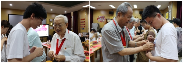 大会开始前,光荣在党50年的老党员们在党员之家活动室与新发展党员畅谈,并为新发展党员佩戴党徽,共同合唱《没有共产党就没有新中国》,一句句嘹亮的歌声传递着对党的无限深情,对老党员的无上崇敬。