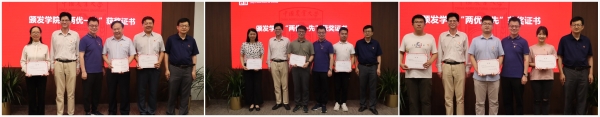 学院党委委员、副院长王军军宣读学院党委关于表彰“两优一先”的决定,学院党委委员邹东云、王军军、马秋刚为38名优秀师生共产党员,4名优秀党务工作者和3个先进基层党组织颁发荣誉证书。