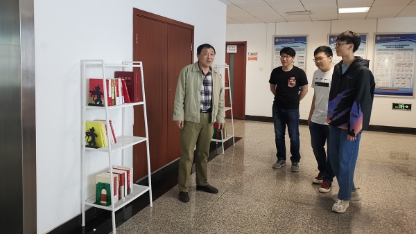 动物遗传系教工党支部支部书记连正兴与支部党员一同参观了读书角,分享了经典的党史书籍,并对红色读书角建设情况给予现场指导。