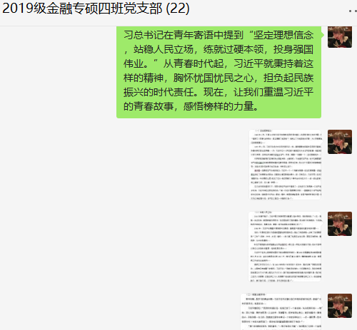 5月15日上午9点,2019级金融专硕四班党支部以微信群聊方式开展了以“弘扬五四精神”主题党日活动,全体党员与积极分子参加了此次党日活动。
