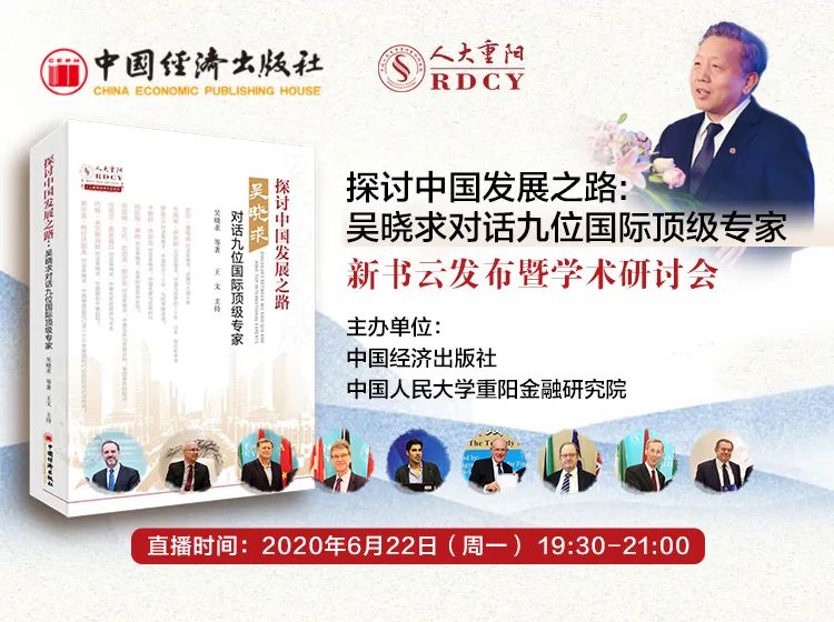 2020年6月22日晚,由中国经济出版社和中国人民大学重阳金融研究院(以下简称“人大重阳”)共同举办的《探讨中国发展之路: 吴晓求对话九位国际顶级专家》新书发布会暨学术研讨会在线上圆满举行。这是继中国人民大学副校长吴晓求教授对话九位国际顶级专家之后,国内专家对中国发展之路的又一次深入探讨。研讨会在百度、新浪财经、中宏网、每日经济新闻、中国网等多个平台同步直播,引发广泛关注,在线观看人数近60万。网友在留言区呼应专家观点,讨论热烈。